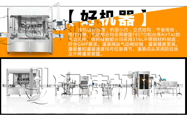 全自動辣椒醬六頭灌裝機(jī)作為公司新研發(fā)的灌裝設(shè)備在市場上起到了關(guān)鍵性的作用,是集光,機(jī),電,氣于一體,采用活塞式定量原理,灌裝精度高,操作簡單,維護(hù)方便,設(shè)備主要材質(zhì):采用SUS304不銹鋼制造,符合衛(wèi)生要求.灌裝過程采用亞克力透明板與外界隔離,保證灌裝的衛(wèi)生要求。灌裝采用壓力式灌裝,無需配裝高位罐,簡化了安裝工序,提高了灌裝效率。可廣泛應(yīng)用于食品、醬料行業(yè)產(chǎn)品的自動化包裝生產(chǎn)。