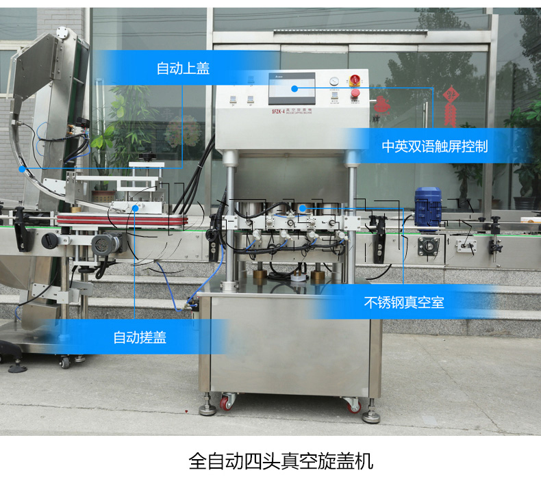 該生產(chǎn)線適合中小口徑三旋、四旋玻璃瓶調(diào)味醬的分裝,適合醬料、含顆粒黏稠物料的灌裝,物料接觸部分均采用316不銹鋼,整機(jī)304不銹鋼,符合食品衛(wèi)生標(biāo)準(zhǔn)。該機(jī)設(shè)計(jì)合理,機(jī)型小巧,立式結(jié)構(gòu),節(jié)省場地,操作方便。啟動(dòng)部分均采用FESTO和臺(tái)灣AirTack的氣動(dòng)元件。灌裝閥有氣動(dòng)閥控制,灌裝精度更高,灌裝量和灌裝速度均可任意調(diào)整,灌裝悶頭采用防拉絲及升降灌裝裝置。